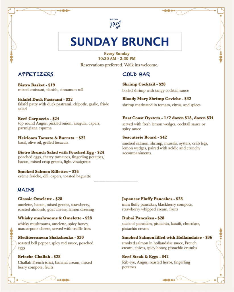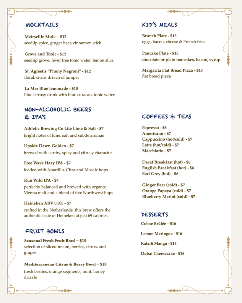 Sunday Brunch is offered à la carte. Coffee, tea, mocktails and mimosa/bellini mixes are available.