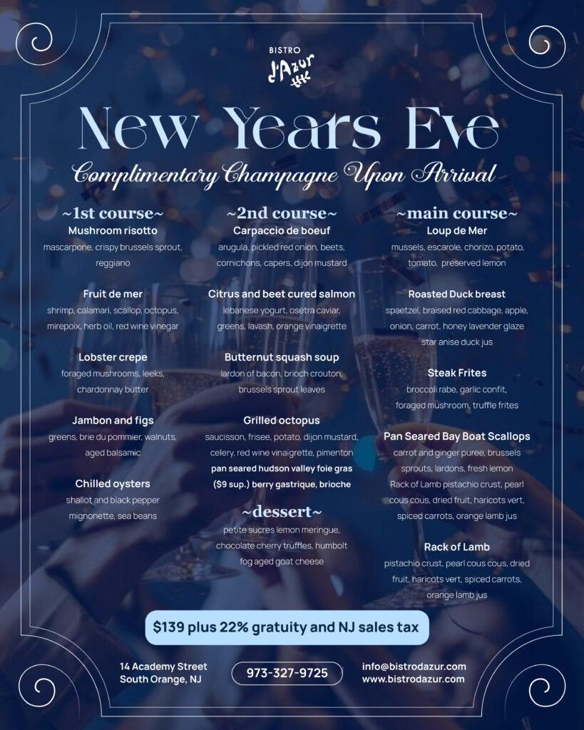 Bistro d’Azur makes that easy. Our holiday menu—whether it’s the comforting Butternut Squash Soup, the festive Apricot Glazed Chicken, or the tender Petit Filet Mignon—feels like a celebration in every bite.