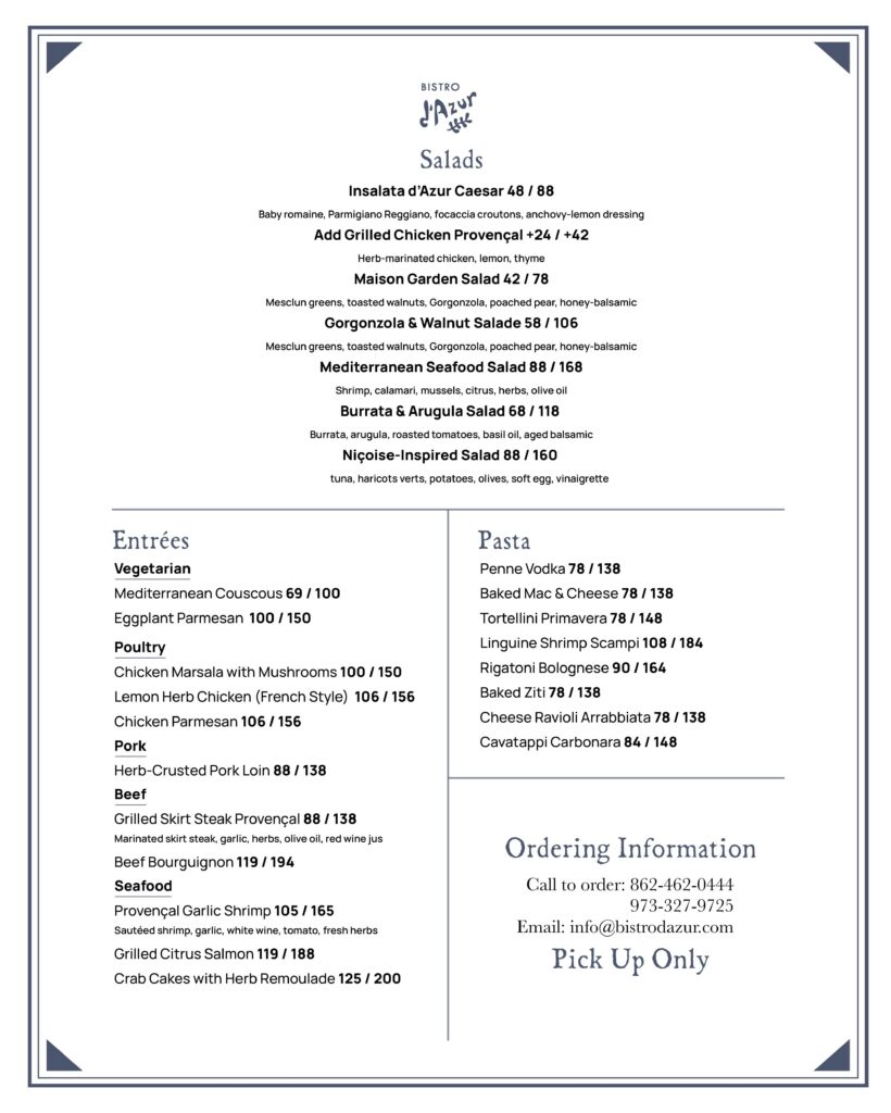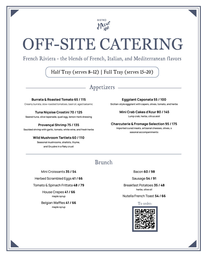 At Bistro d’Azur, special occasions are elevated with the vibrant flavors of the French Riviera – where Mediterranean, French, and Italian influences come together – thoughtfully delivered to your chosen location.