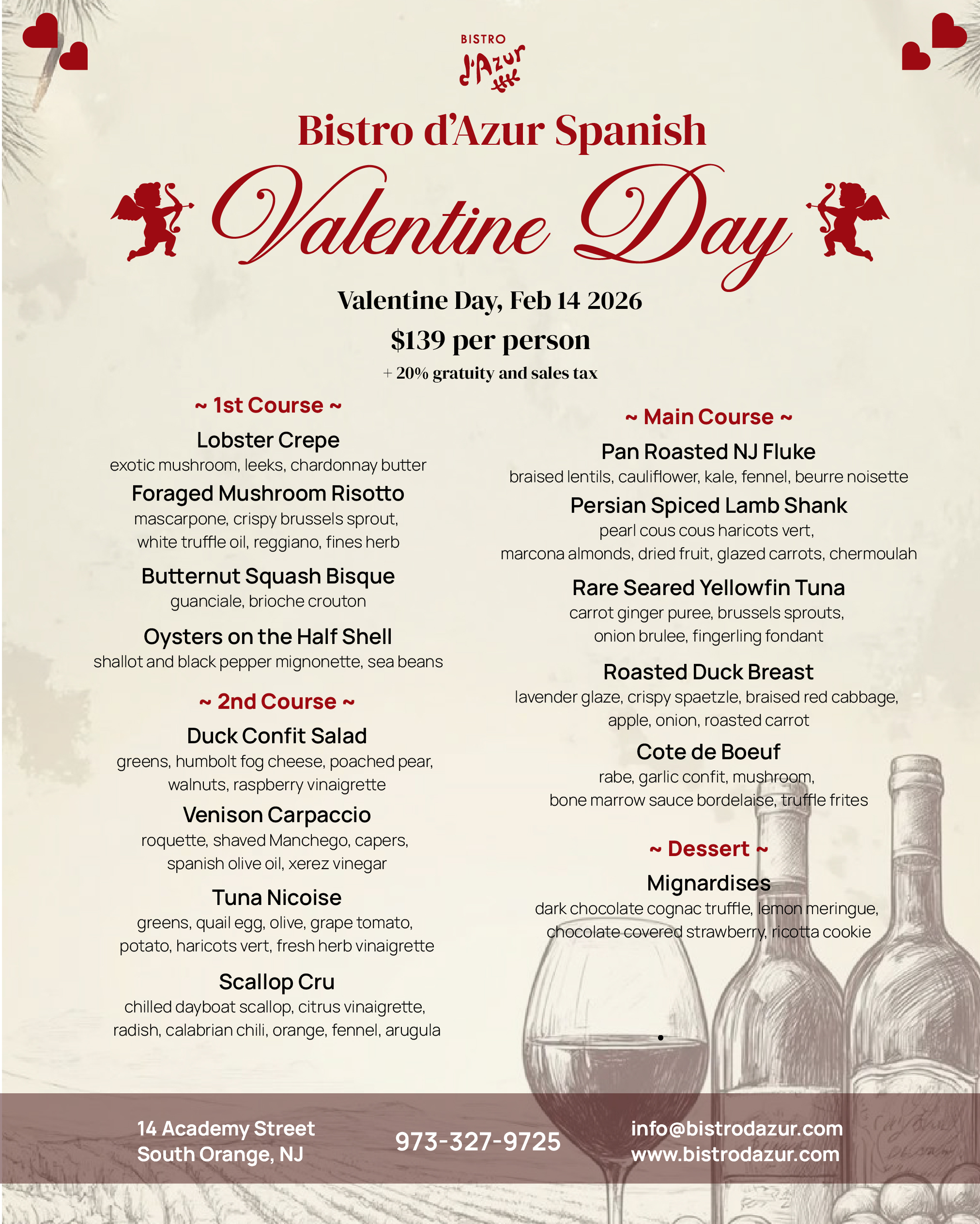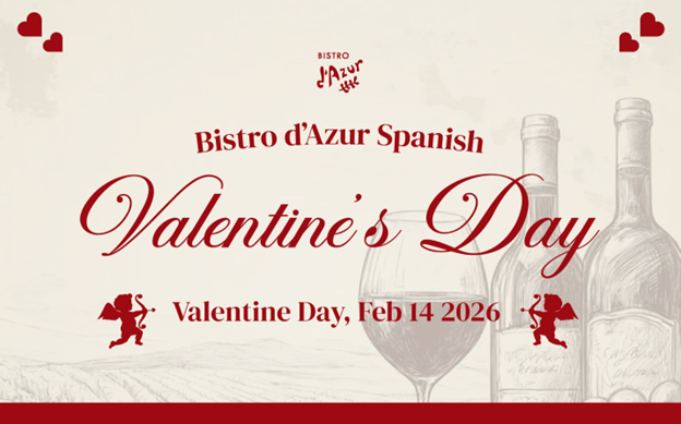 This Valentine’s Day, escape to Spain at Bistro d’Azur. Our Spanish-inspired menu celebrates bold flavors, shared plates, and the romance of lingering over great food and wine.