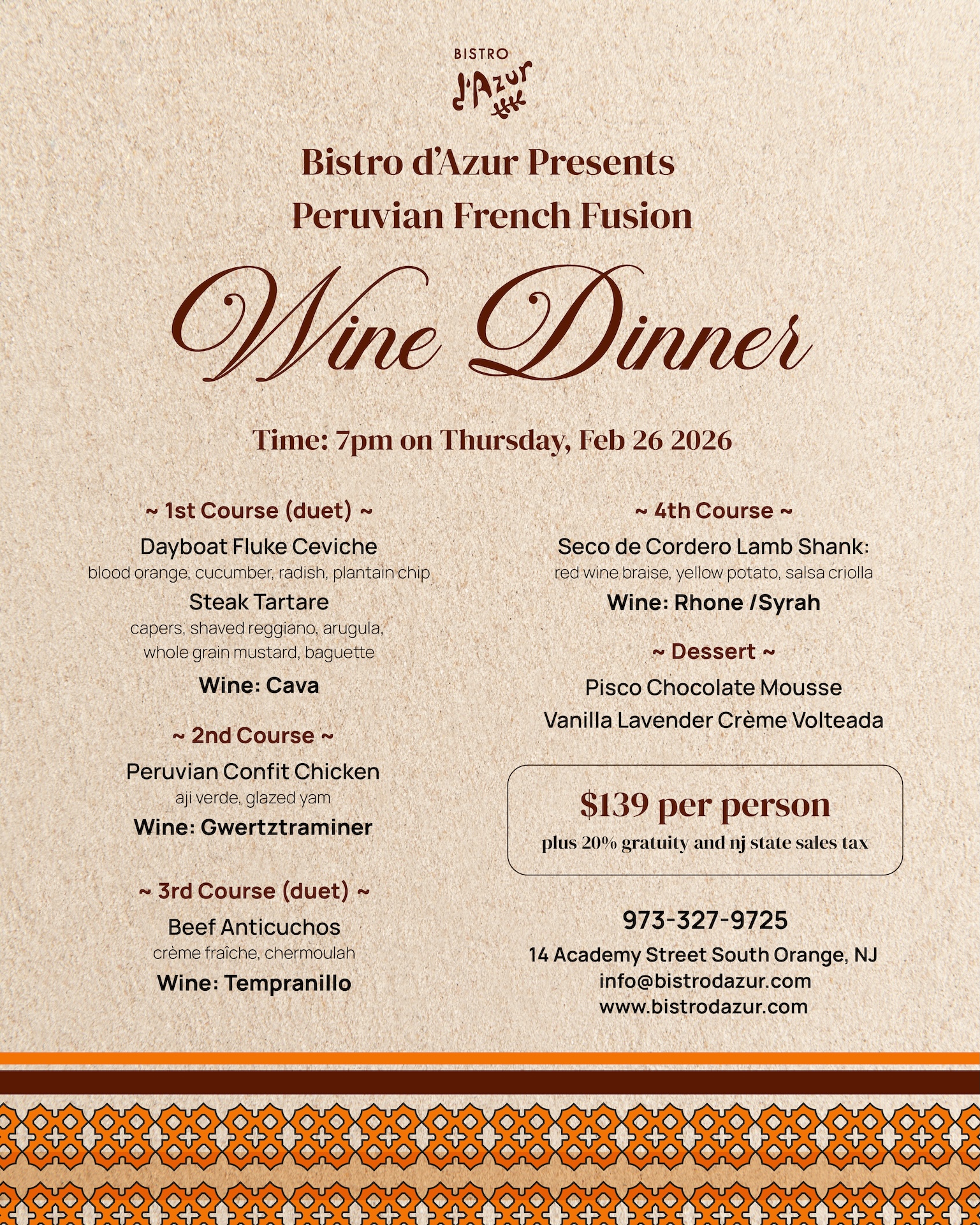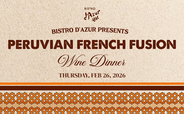Our Peruvian French Fusion Wine Dinner brings this history to the table with dishes like dayboat fluke ceviche, steak tartare, Peruvian confit chicken, beef anticuchos, and a slow-braised lamb shank (an all time bestseller!), each thoughtfully paired with wines from Cava to Rhône Syrah. The evening concludes with pisco chocolate mousse and vanilla lavender crème volteada.