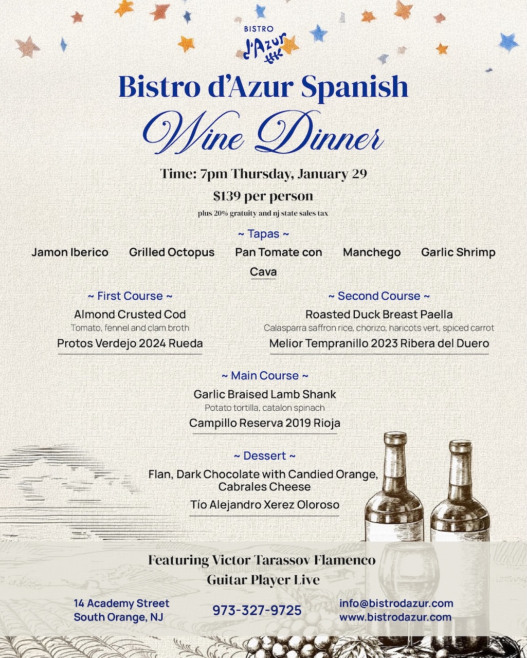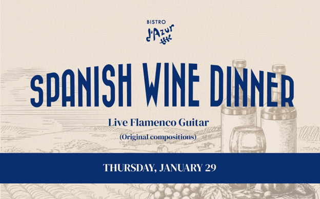 Join us for a Spanish Wine Pairing night at Bistro d’Azur for an unforgettable celebrating the flavors and spirit of Spain. Enjoy thoughtfully paired courses – from classic tapas and Cava to duck paella with Tempranillo and garlic-braised lamb with Rioja, each dish showcasing Spain’s iconic regions.